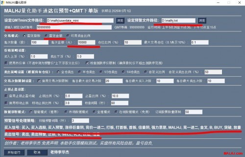 一.MALHJ助手专业同花顺版主要定制:(避免每次运行软件都得重新修改输入) 1.绑定自己的QMT帐号 2.设定同花顺路径,如:D:\同花顺XX版\mx_999XXX\stockblock.ini 3.设定QMTmini路径文件夹,如: E:\某某证券QMT交易端\userdata_mini 4.设定监控的动态和我的板块名称:自选1,一进二,打板等 (一旦选好了动态板块,只需在同花顺改名字,马上自动下单) 5.可以设守固定交易模式的固定金额(也可以自由设置) 如图红色部份: 图片:991.JPG 二.MALHJ助手专业通达信版主要定制:(避免每次运行软件都得重新修改输入) 1.绑定自己的QMT帐号 2.设定预警文件路径,如:D:\malhj.txt 3.设定QMTmini路径文件夹,如: E:\某某证券QMT交易端\userdata_mini 4.绑定自己想自动买卖的具体预警名称:一进二,打板,买入,打首板等 (对于符合预警名称一致的预警进行快速自动交易) 5.可以设守固定交易模式的固定金额(也可以自由设置) 如图红色部份: 图片:992.JPG 定制费用详情: http://www.malhj.com/read-217.html 还没有达到量化交易的,只是想用MALHJ专业版系列排序公式 详情:http://www.malhj.com/read-201.html 想更多了解MALHJ量化助手专业版的粉丝可加 微信号:w1968131366(非诚勿扰,不喜勿加) 手机微信同号:15907742318(非诚勿扰,不喜勿加) 。 或者扫码加好友